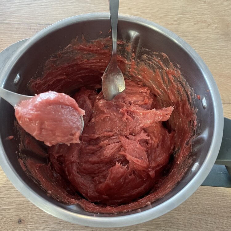 - Passer la pâte au mixeur assez longtemps, jusqu'à ce que le mélange devienne un peu rose comme une mousse de foie... rose.