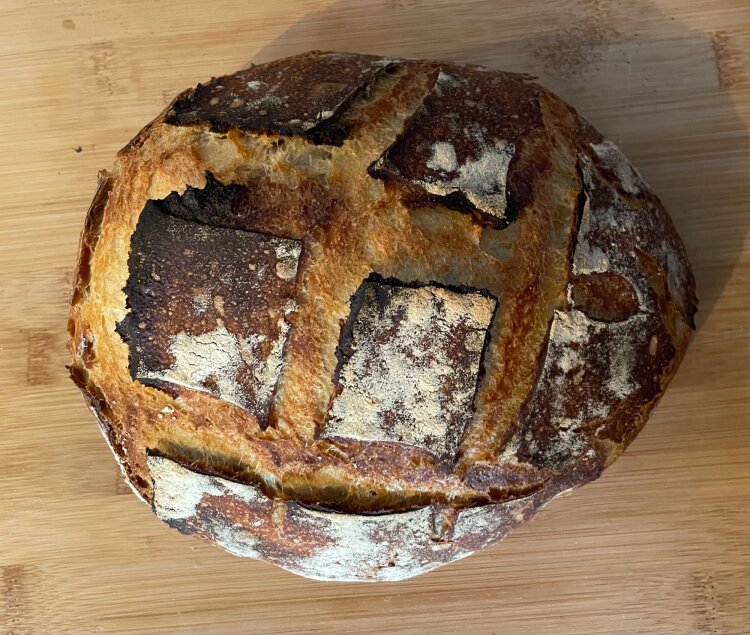 - Jour 2 (soir) : 250g de farine T80 + le levain du matin + 140g d'eau + 4g de sel, bien mélanger, ajouter des graines si voulu, laisser reposer dans un bol recouvert d'un torchon toute la nuit