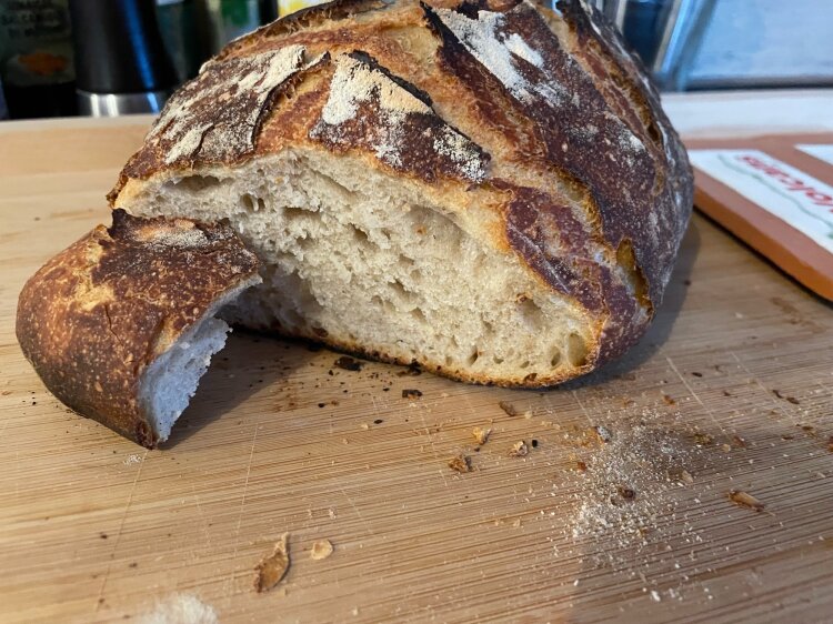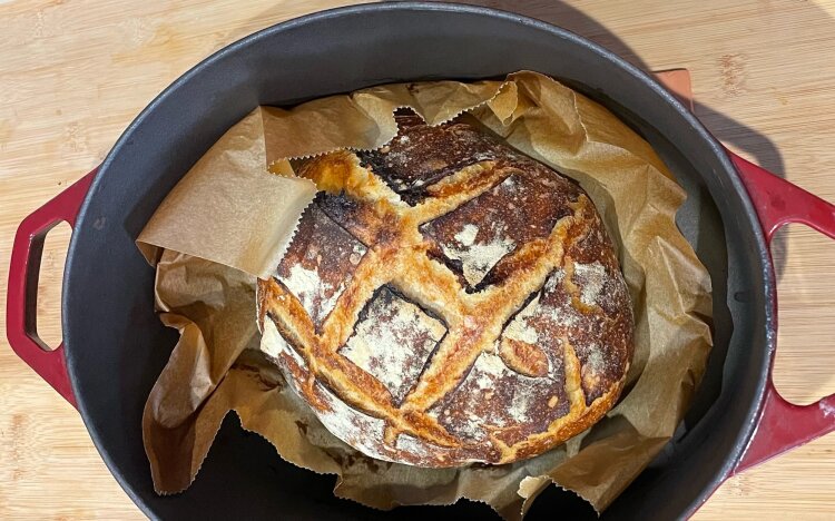 - Quand la cuisson est terminée, rallumer le four pour 5 minutes en retirant le couvercle de la cocotte pour que le pain grille un peu sur le dessus.