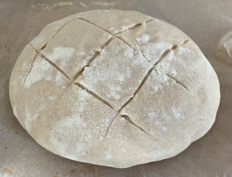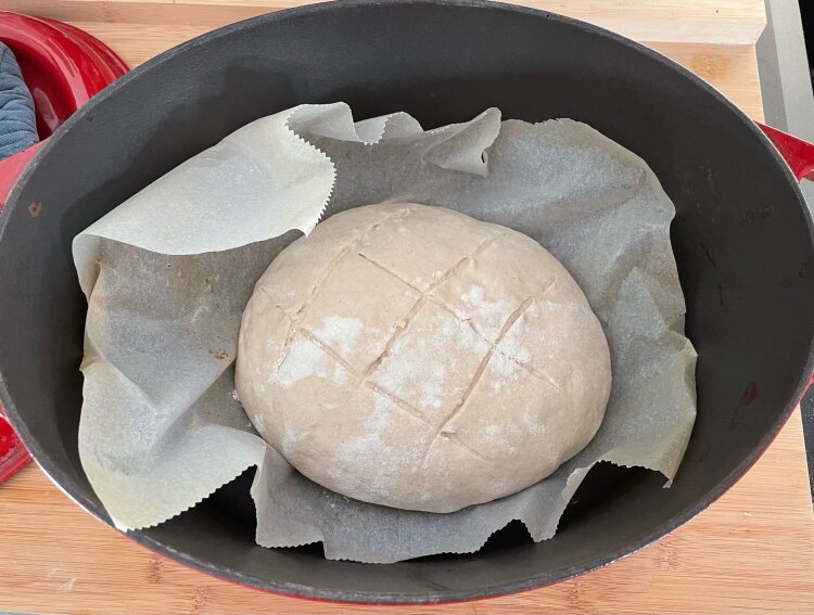 - Quand le four est chaud, déposer la boule (jonctions vers le bas) sur un papier sulfurisé, faire des incisions avec un couteau puis mettre dans la cocotte.